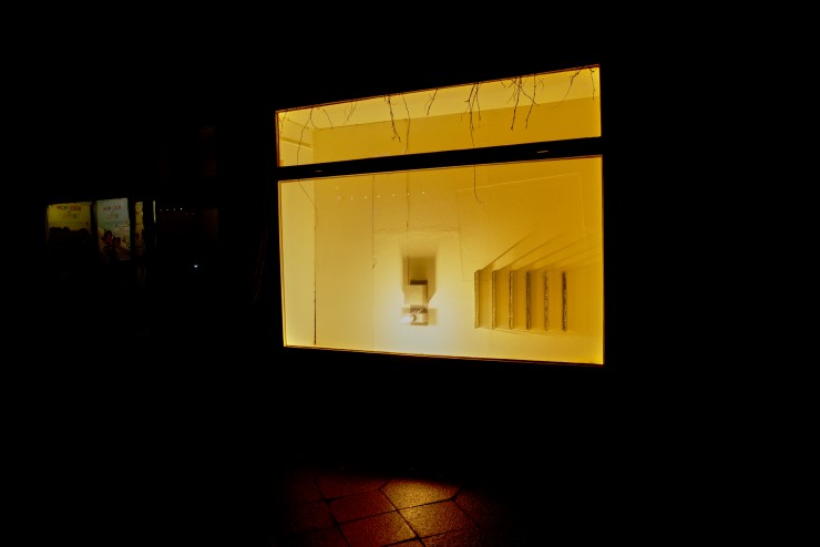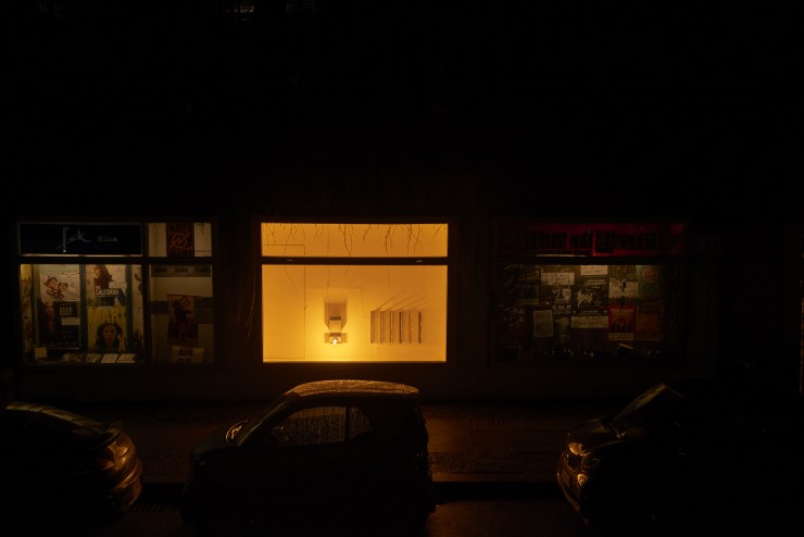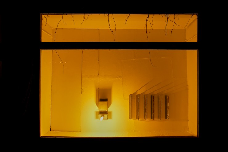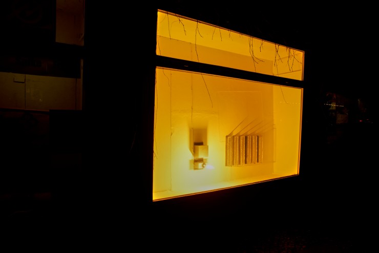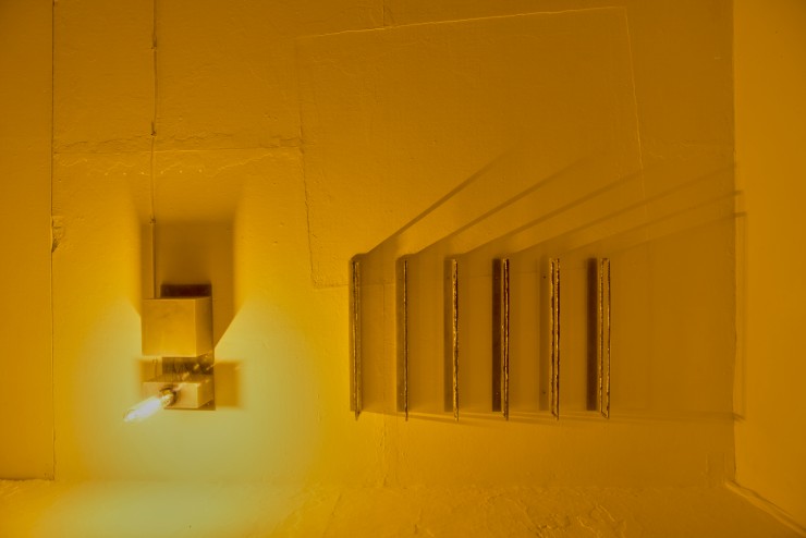 Form, Licht und Schatten lassen die Sox Vitrine zu einem Gehäuse für eine Apparatur werden, die durch ihre Erscheinung eine Verbindung nach Außen erahnen lässt. Der Titel „Heizungsraum“ bestärkt diese Ahnung und beeinflusst die BetrachterInnen, das funktional wirkende Form-Gebilde an ein System zu koppeln, welches in seiner Gesamtheit niemals ganz erfassbar ist: Heizungsräume sind Herzstücke raumübergreifender Systeme, von denen wir abhängig sind, und die funktionieren müssen. Normalerweise werden die Räume, die eigentlich keines Einblicks würdig sind, durch eine Brandschutztür verschlossen gehalten. In Grebers Heizungsraum findet die Verbindung nach Außen nicht im Verborgenen statt. Durch ein grelles gelbes Licht an einem nüchternen Kasten werden längliche, senkrechte Halterungen beleuchtet, an denen glänzendes, in Form gegossenes Zinn haftet. Es handelt sich um das eingeschmolzene Material einer vorherigen Version der Arbeit. Der Titel „Heizungsraum“ legt eine falsche Fährte. Bringt man ihn mit der mystisch aufgeladene Vielschichtigkeit des Konstrukts aus Licht und Material in Verbindung, scheint es wie, wenn ein Gedicht von Paul Celan immer wieder durch Anweisungen einer Bauanleitung unterbrochen wird. Das strahlende Glühen dient vielleicht keiner Wärmeerzeugung mehr und ist nur noch die Ausschüttung letzter überflüssiger Energie, in deren Licht die Zinnformen Schatten an die Wand werfen.
