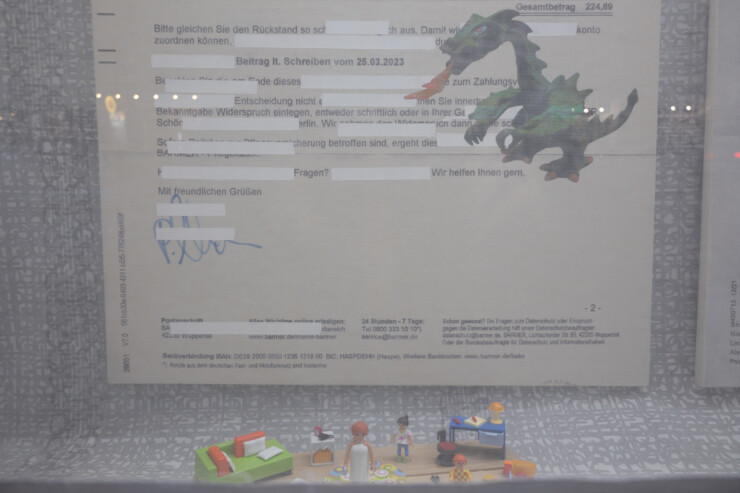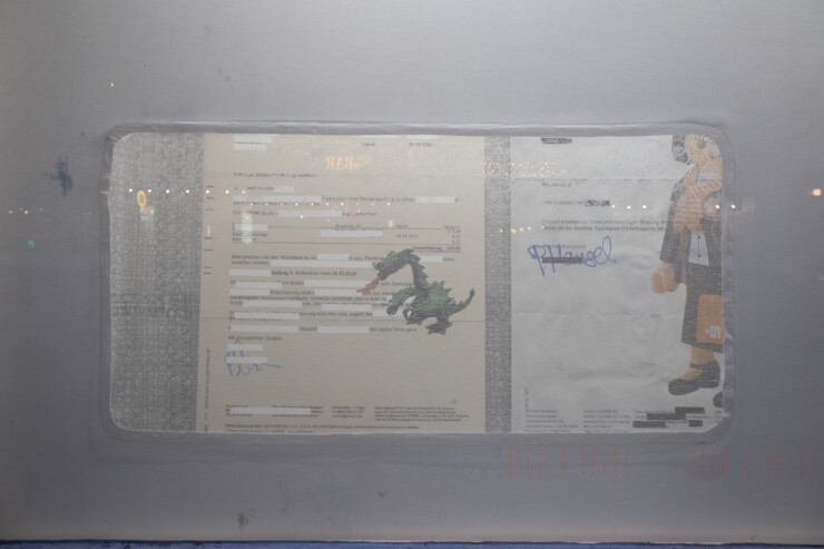 Die Vitrine der Dinge wird zum Schauplatz eines riesigen Dokumentenbriefs, sie ist von diesem bis ins Innerste ausgekleidet. Das so vertraute Format mit dem Adressfenster wird plötzlich zu einem anklagenden Monument im Hinblick auf die gewaltigen und überfordernden bürokratischen Hürden die damit zusammenhängen. Durch das Aufreißen des Briefes verliert der Umschlag seine Funktion als Schutzhülle für vertrauliche Informationen und gibt dazu stellenweise den Briefinhalt frei. Der Brief wird regelrecht durchleuchtet und seziert, der Bearbeitungsstatus bleibt jedoch unklar. Welche offenen Rechnungen und möglichen Konflikte stehen im Raum? Nur die Spuren von Stempeln und Barcodes auf dem Umschlag sowie der zum Teil geschwärzte Brief im Hintergrund verweisen auf mögliche Absender und Empfänger. Die persönliche Geschichte hinter dem geöffneten Brief bleibt jedoch unbekannt. In seiner extremen Vergrößerung verlässt der Brief die Realität und ist physisch nicht mehr zu händeln. Er wird vielmehr zum Raum selbst, zu einem intimen häuslichen Raum, in dem wir von Dingen in unseren alltäglichen Handlungen herausgefordert werden.