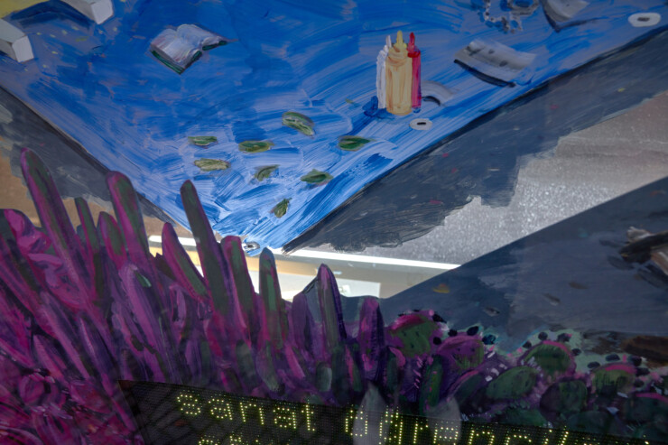 The storylines are clearly separated from each other in terms of content, but spatially they are drawn together in such a way that the LED font can be reduced to a purely visual element. The dialogs light up other immaterial conversations taking place.