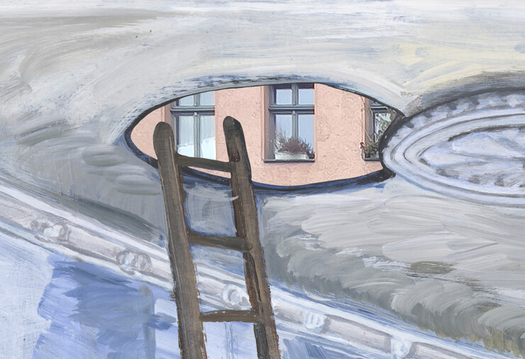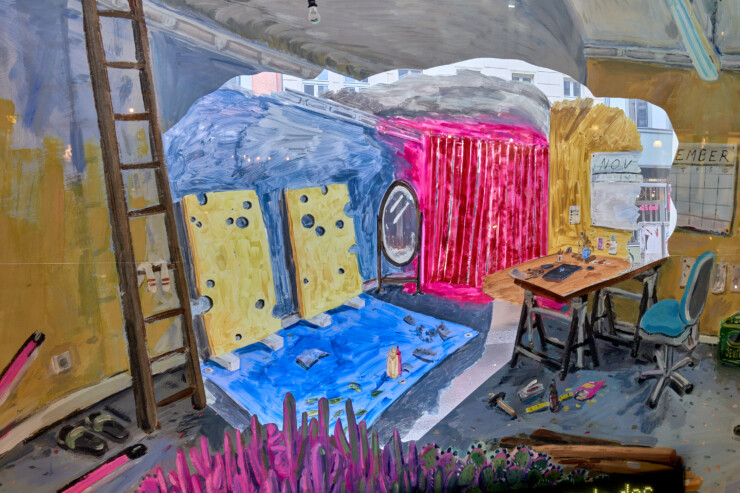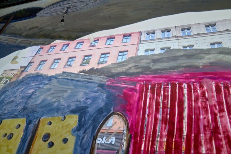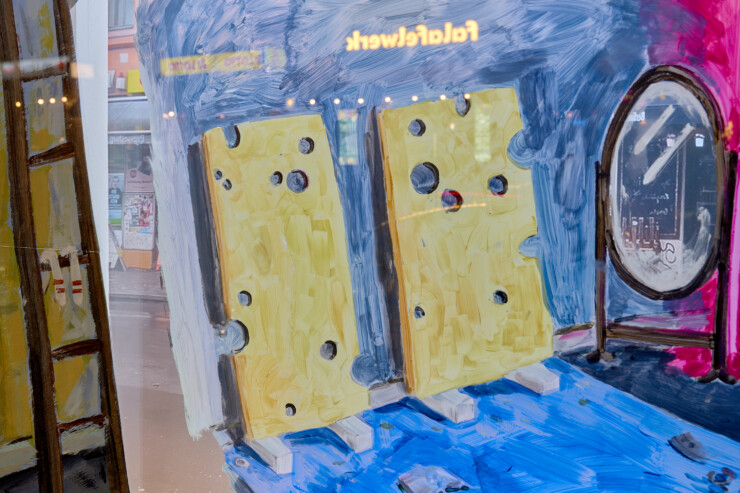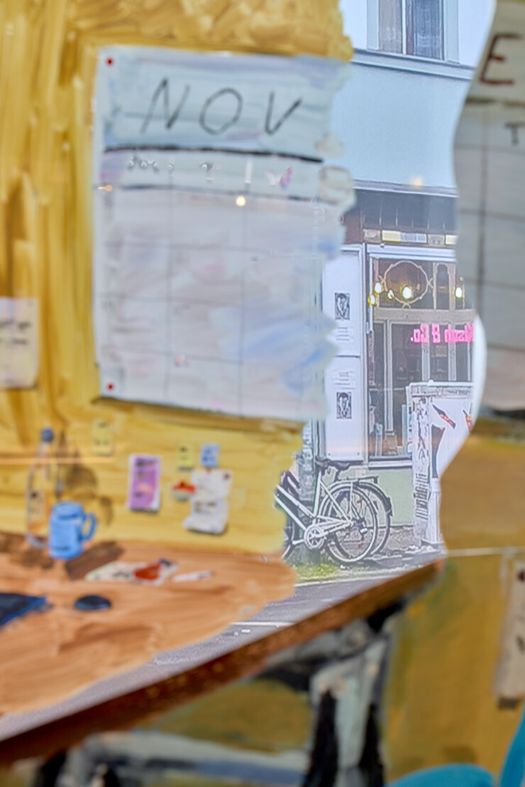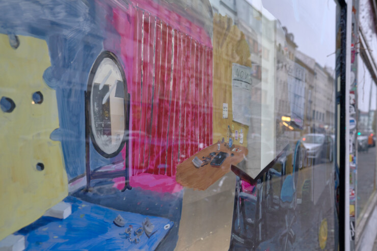 With the precision of the nature studies by Maria Sibylla Merian and a phantasy of Carl Barks, who is the creator of Duckburg and most of its dwellers the conversations between the protagonists, the materials, the different spaces, inside and outside, glass and textile, A and B, street and window, you and me are overlapping and through visible.