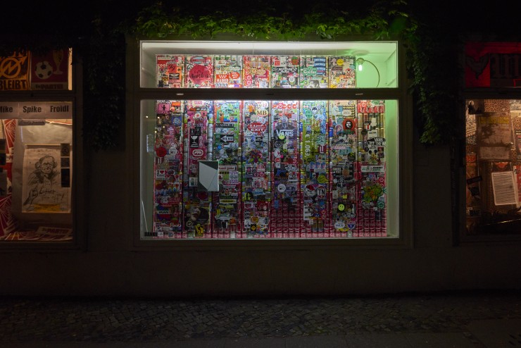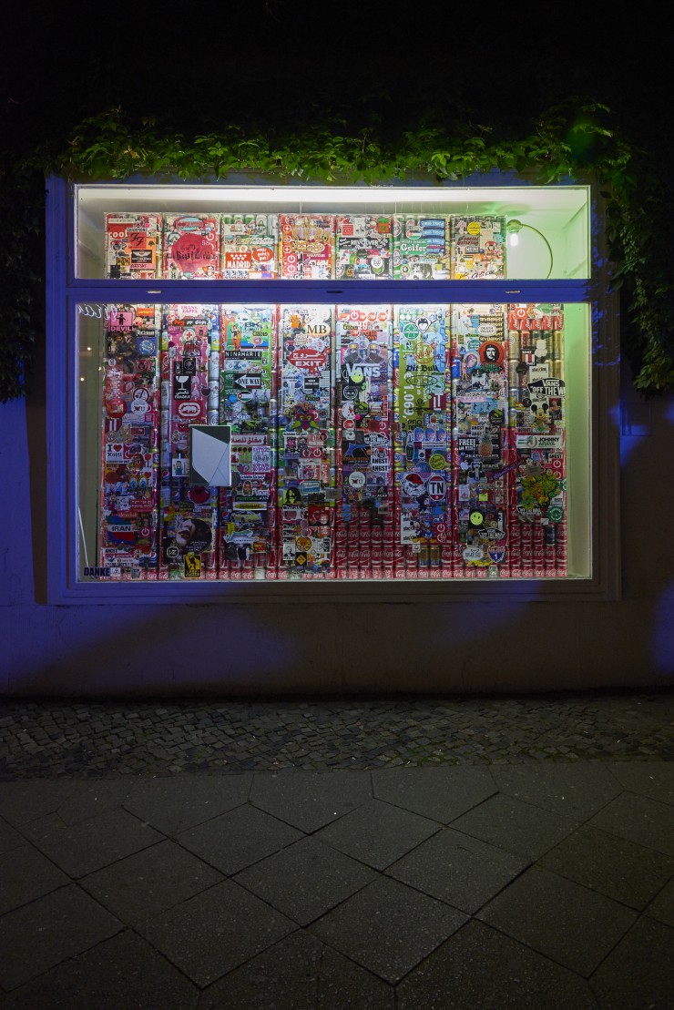 Die für das SOX entstandene Installation von Frank Nitsche ist, wenn man so will, ein dreidimensionales Sammelalbum. Aufkleber als Fundstücke ausgedehnter Reisen bedecken in weitestem Sinne Verbauchsmaterial seiner Malerei – Getränkedosen, Kanister und anderes Verpackungsmaterial aus der Studioproduktion. Kunst ist eine Industrie. Die Industrie erzeugt Reste, die normalerweise am Hinterausgang des Studios entsorgt werden. Nitsche aber praktiziert Recycling in seinem ganzen Werk. Seine Malerei ist voll von Zeichen, Symbolen, Formen, die er in Medien und Popkultur findet, sammelt, enzyklopädisch in Alben ordnet und in die malerische Formgebung einfließen lässt. Unfallbilder und Wissenschaftsillustrationen werden da abstrahiert und montiert. Vom Comic bis zur medizinischen Deformation kann alles Material werden und gerinnt am Ende in Bildern zu einer autonomen Analyse der Formen. Wenn auf diese Weise jeder Aufkleber aus Kairo, jeder Sticker aus der texanischen Provinz zur Vorlage einer ständig in Betrieb befindlichen Malereimaschinerie werden kann, ist das Schaufenster des SOX nun Archivdisplay und öffentliches Album. Es ist aber auch eine öffentliche Installation, in der das Gefundene an die Öffentlichkeit zurückerstattet wird. Konkurrierend, klein, überschaubar und unbeirrt hängt zu seiner Seite, kneipenspießig beleuchtet, eine Leinwand. Das Tafelbild sichert sich sein Refugium. Eingenischt ins Chaos ist die Malerei auch eine Verheißung. Sie steht quer zum universalen Fließen der Zeichen und hält die Bewegung an. Der Raum für autonome Gesten ist begrenzt. Schrumpft er? War er immer eine Nische? Muss man ihn einfach nur wahrnehmen? Sollten wir Malerei gleichmütig als alternative Wahrnehmungsform akzeptieren? Am Ende ist es das, worum es geht. Nitsche entscheidet die Fragen nicht, er stellt sie lakonisch belustigt fest und zur Schau.