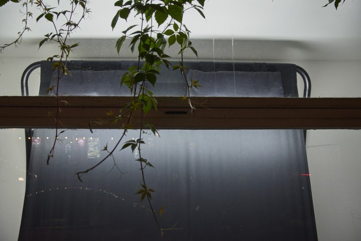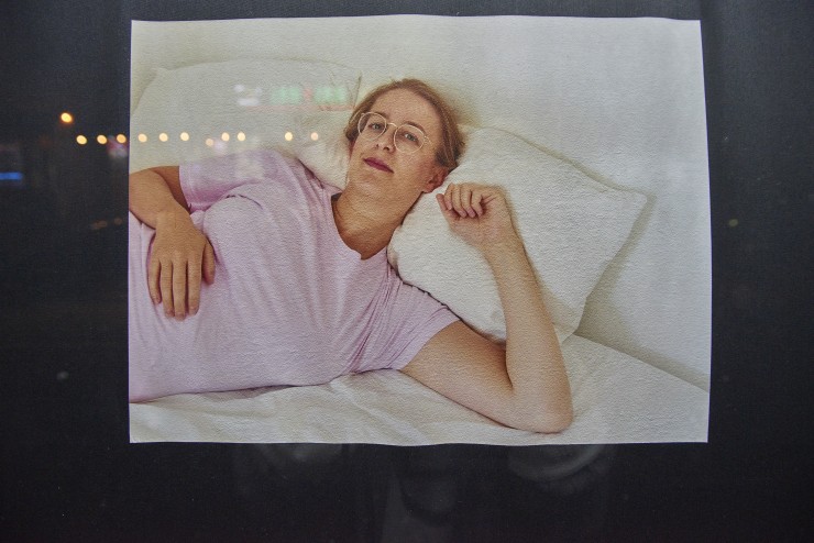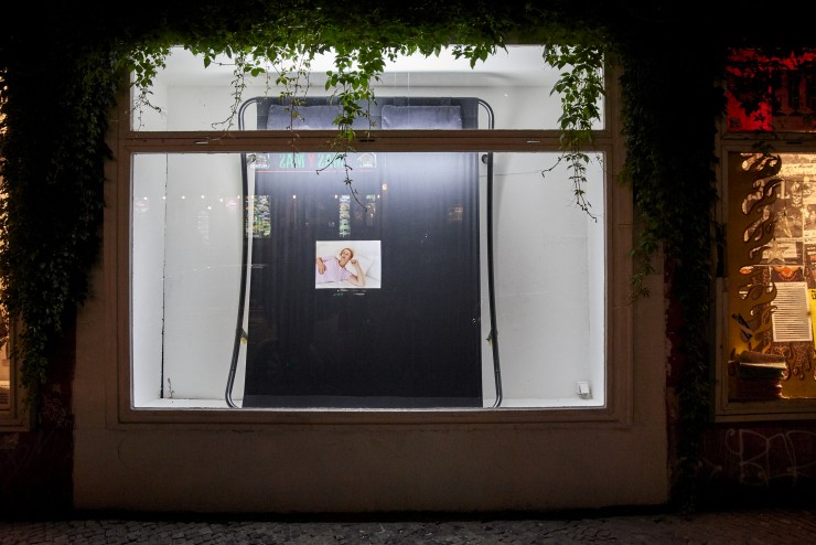 Die Ausstellung Leisure Pleasure Liegen zeigt im SOX Schaufenster stehend eine Liege, auf deren Liegefläche ein Foto gedruckt ist, das die Künstlerin beim Liegen zeigt.