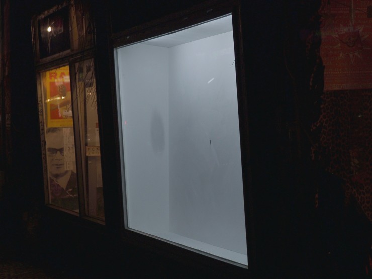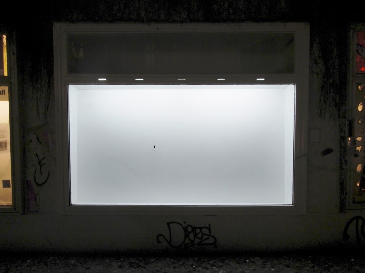 Der schmale Raum in dem Schaufenster ist leer. Es ist nichts zu sehen außer einem Loch in der Rückwand, vor dem die Scheibe getrübt ist.