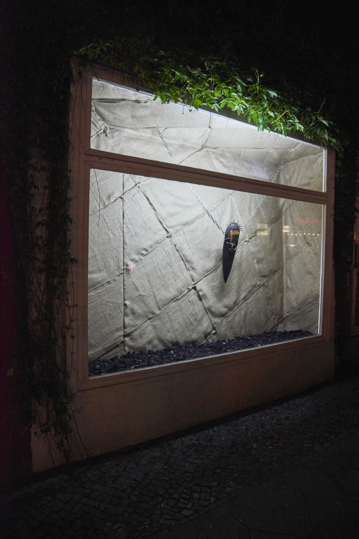 The title „FACTITIUS“ means false idols but it also has roots in the word fetishism. A word familiar in the gay fetish scene. This explanation is the only objective reflection that exists in Michael Sayles’ installation. Here Michael Sayles has made a mask that delivers us into an african ideal where “Masks are not representations of spirits but the means through which spirits manifest themselves. They embody supernatural powers that are required to be present at every important event and when social control is exercised.” By covering the interior space of the display window he has created a warm and yet rough ambience using sackcloth. The appearance of the mask is both a hommage to the creativity and ingenuity of african antiquity and a precise expression of the artist aspirations in our technological society. The use of the everyday objects on the mask is the way the artist determines the Zeitgeist, linking the past with the present and our public and private spaces.
