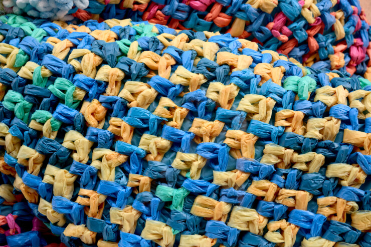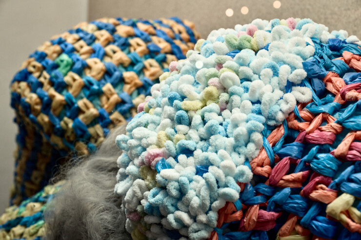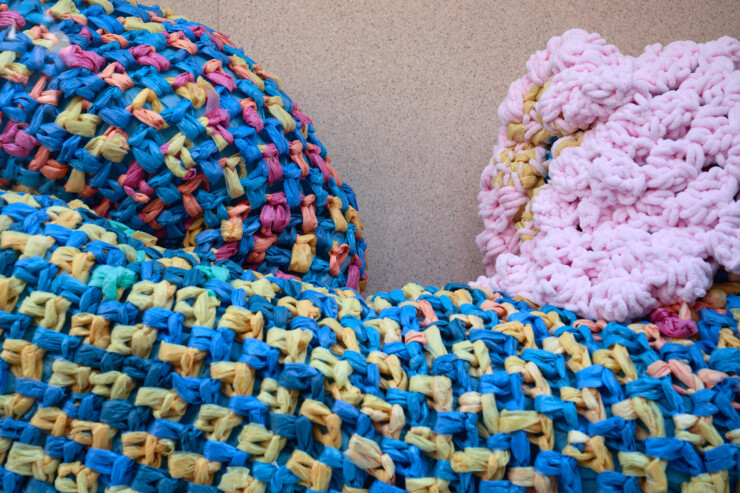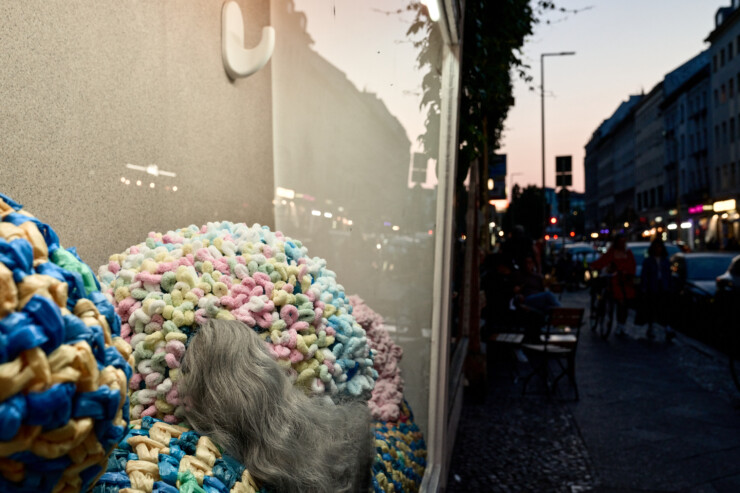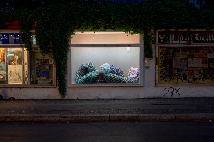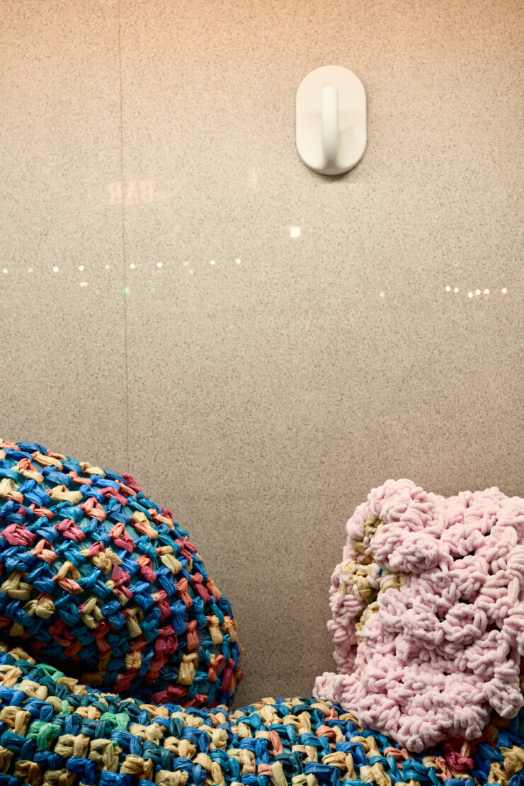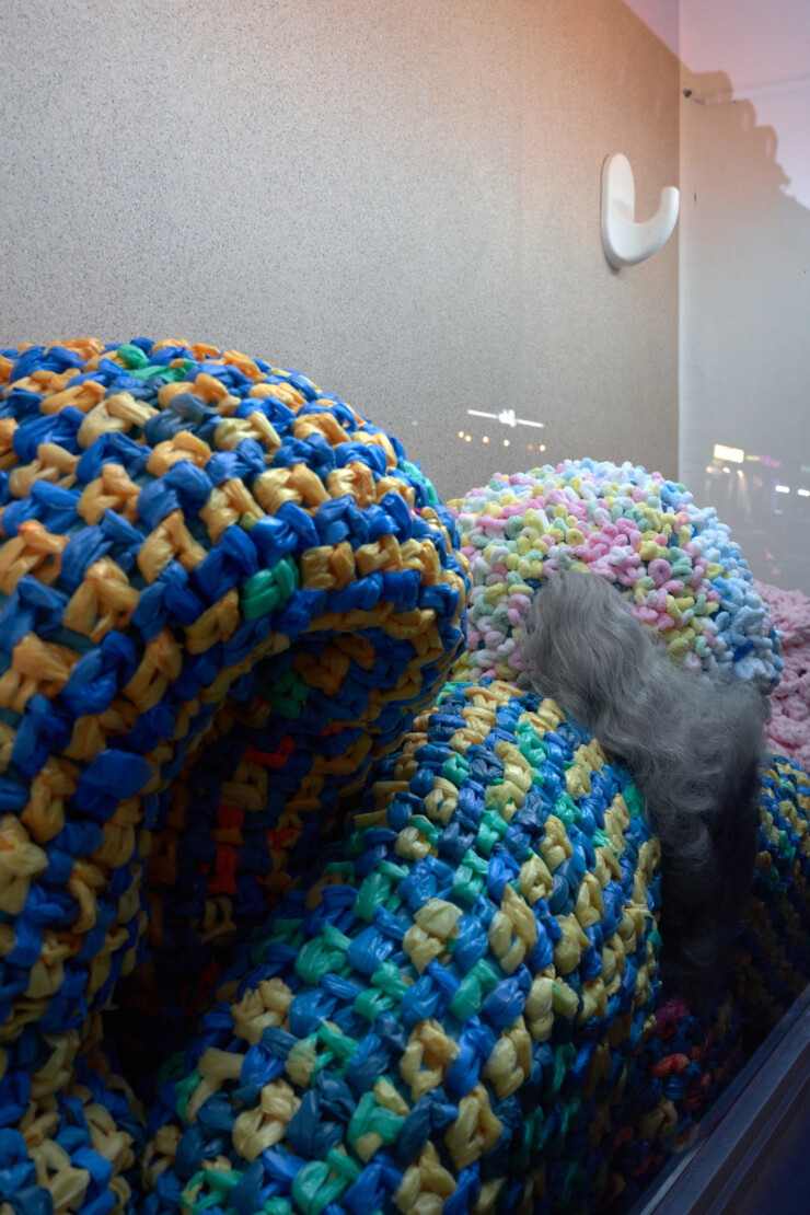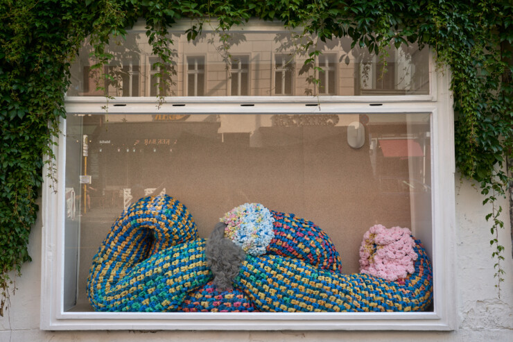 F: «… but your rhythms of crochet needles threaten to burst the narrowness of the shop window with space-displacing force and, moreover, heavy-weight.»