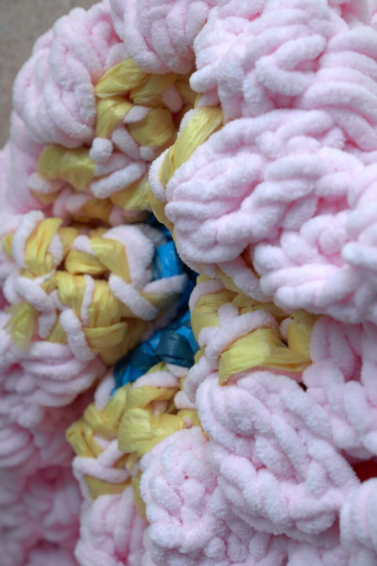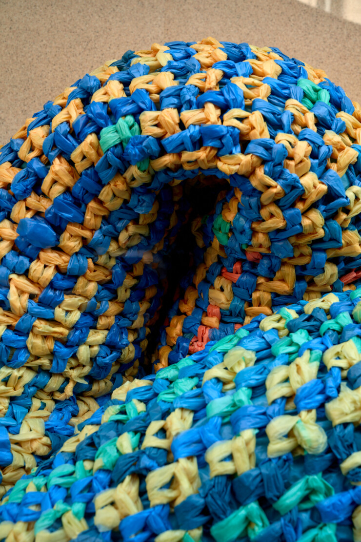 F: «… sondern deine Häkelrhythmen drohen mit Raum verdrängender Kraft und außerdem schwergewichtig die Enge des Schaufensters zu sprengen.»