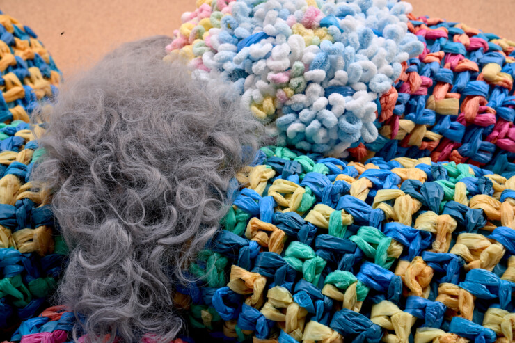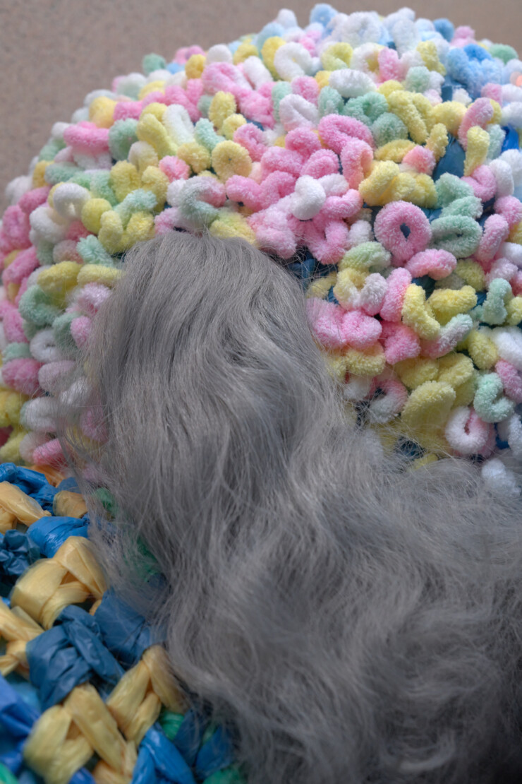 F: «Nein, das meine ich gar nicht! Außerdem wird bei dir gar nichts umgedreht, weil du die hyperreale Nackenrolle ja in Spiralen gehäkelt und nicht zusammengenäht hast, …»